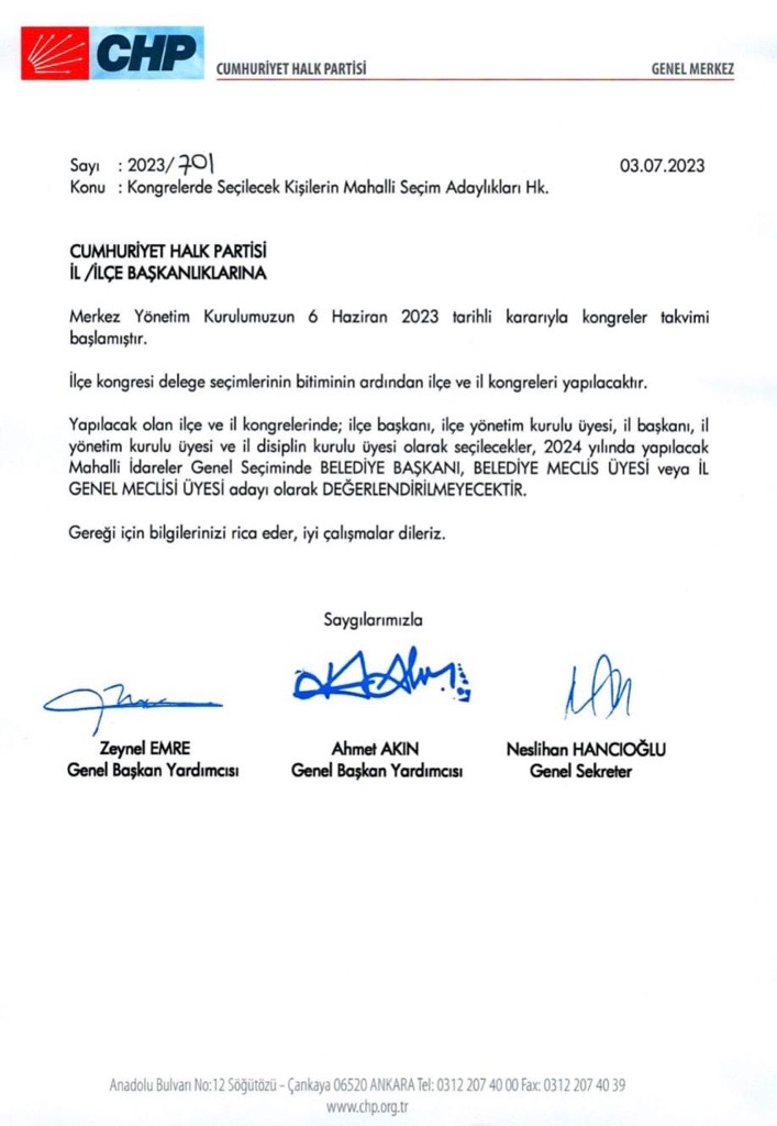 Karara göre önümüzdeki il ve ilçe kongrelerinde yönetimlere seçilecek olan kişiler, 2024 Yerel Seçimleri’nde aday gösterilmeyecek.Açıklamada şu ifadeye yer verdi: “6 Haziran itibari ile parti içi kongre takvimiz başladı. Delege seçimlerimizin tamamlanması sonrası ilçe kongrelerimiz ve il kongremiz gerçekleşecek. MYK tarafından alınan karara göre gerçekleştireceğimiz ilçe kongreleri ve il kongremizde seçilecek olan il başkanı, il yönetim kurulu üyeleri, ilçe başkanı, ilçe yönetim kurulu üyeleri ve il disiplin kurulu üyeleri önümüzdeki yerel seçimlerde belediye başkanı ve belediye meclis üyesi adayı olarak değerlendirmeye alınmayacak. Kamuoyuna ve tüm yol arkadaşlarımıza saygıyla duyurulur”