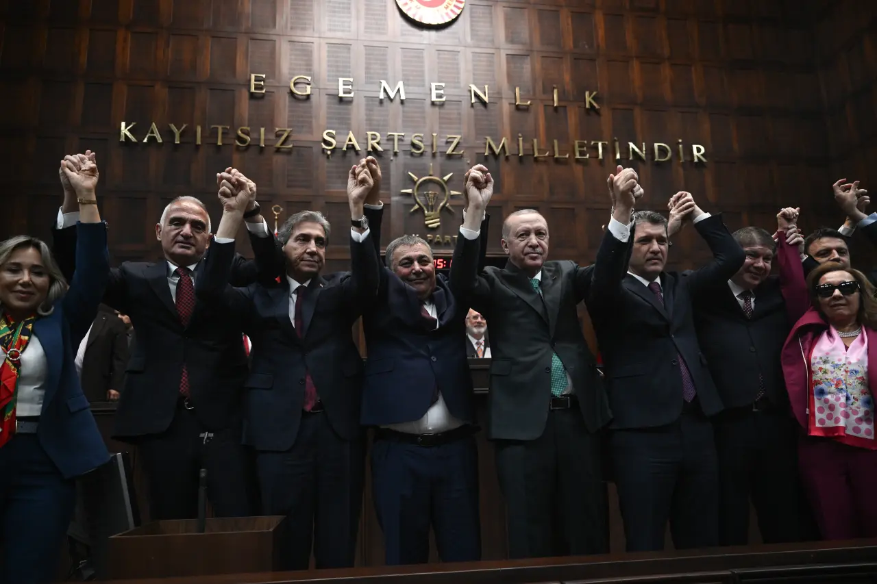 AK Parti grup toplantısında yapılan törende Cumhurbaşkanı Erdoğan, Yıldırım ve Koç’a parti rozetlerini bizzat taktı. Erdoğan, iki başkanı da tebrik etti.