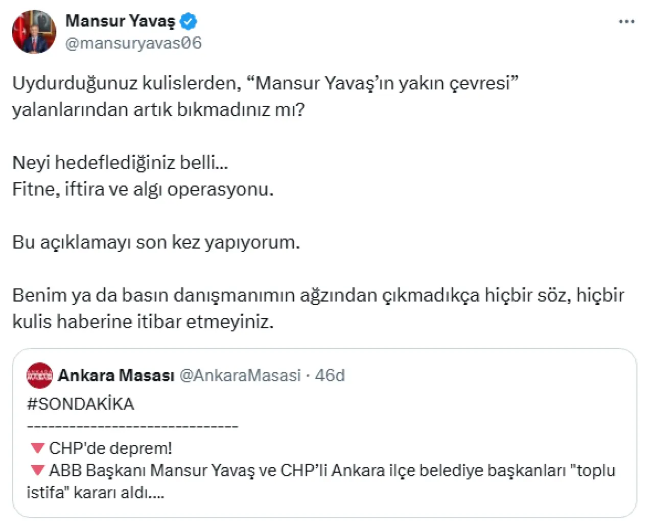 Yavaş paylaşımında, “Uydurduğunuz kulislerden, ‘Mansur Yavaş’ın yakın çevresi’ yalanlarından artık bıkmadınız mı? Neyi hedeflediğiniz belli… Fitne, iftira ve algı operasyonu. Bu açıklamayı son kez yapıyorum. Benim ya da basın danışmanımın ağzından çıkmadıkça hiçbir söz, hiçbir kulis haberine itibar etmeyiniz” ifadelerini kullandı.