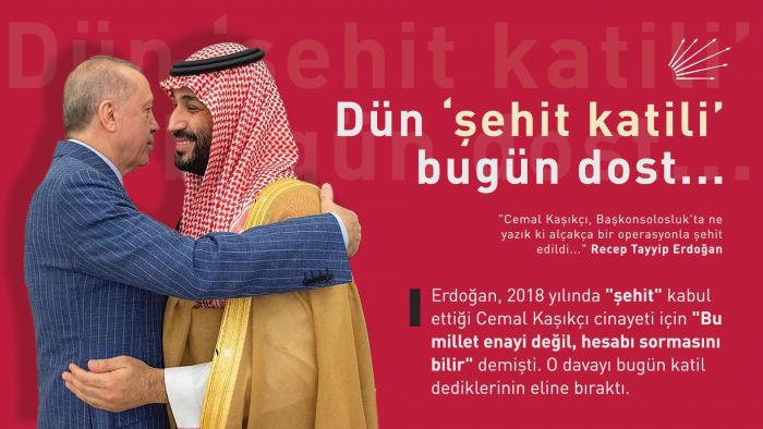 Erdoğan'ın Suudi Arabistan ziyaretini eleştiren CHP'nin sosyal medya paylaşımında, "2018 yılında 'şehit' diye andığı Cemal Kaşıkçı'nın davasını 'katil' dediklerinin eline bıraktı" denildi.
