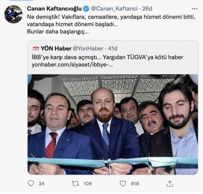 Kaftancıoğlu Twitter hesabından yaptığı paylaşımda, ”Ne demiştik! Vakıflara, cemaatlere, yandaşa hizmet dönemi bitti, vatandaşa hizmet dönemi başladı.. Bunlar daha başlangıç…” ifadesini kullandı.