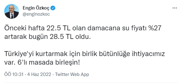 CHP Grup Başkanvekili ve Sakarya Milletvekili Engin Özkoç, damacana suya zam geldiğini açıkladı ve sosyal medya hesabından isyan etti.