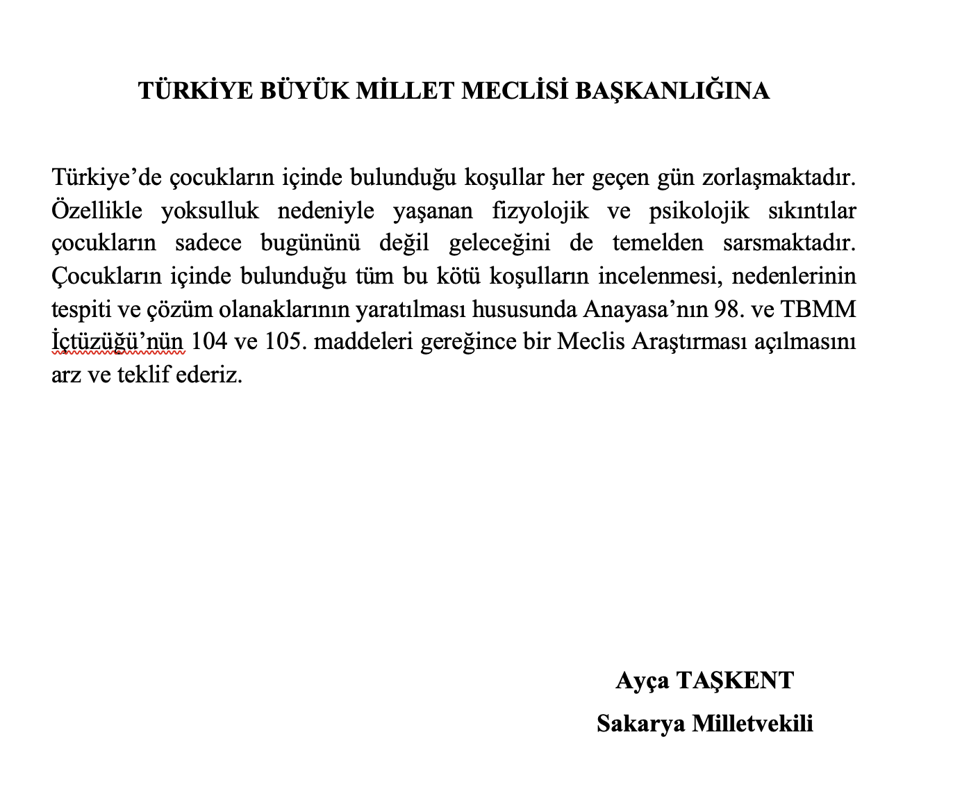 Türkiye’de çocukların içinde bulunduğu yoksulluğun ve yoksulluk nedeniyle yaşanan kötü koşulların nedenlerinin araştırılması, bu koşulları yaratan nedenlerin tespit edilmesi ve çözüm önerilerinin belirlenmesi amacıyla Anayasa’nın 98. ve İçtüzüğün 104. ve 105. Maddeleri gereğince bir Meclis Araştırması açılmasını arz ve teklif ederiz.”