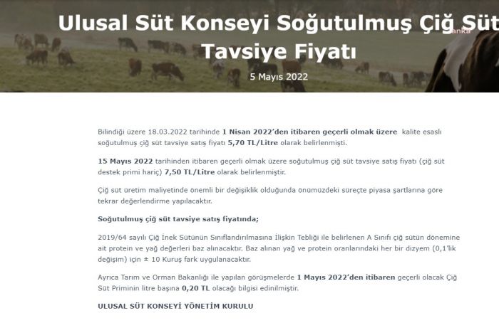 “Bilindiği üzere 18.03.2022 tarihinde 1 Nisan 2022’den itibaren geçerli olmak üzere  kalite esaslı soğutulmuş çiğ süt tavsiye satış fiyatı 5,70 TL/Litre olarak belirlenmişti.