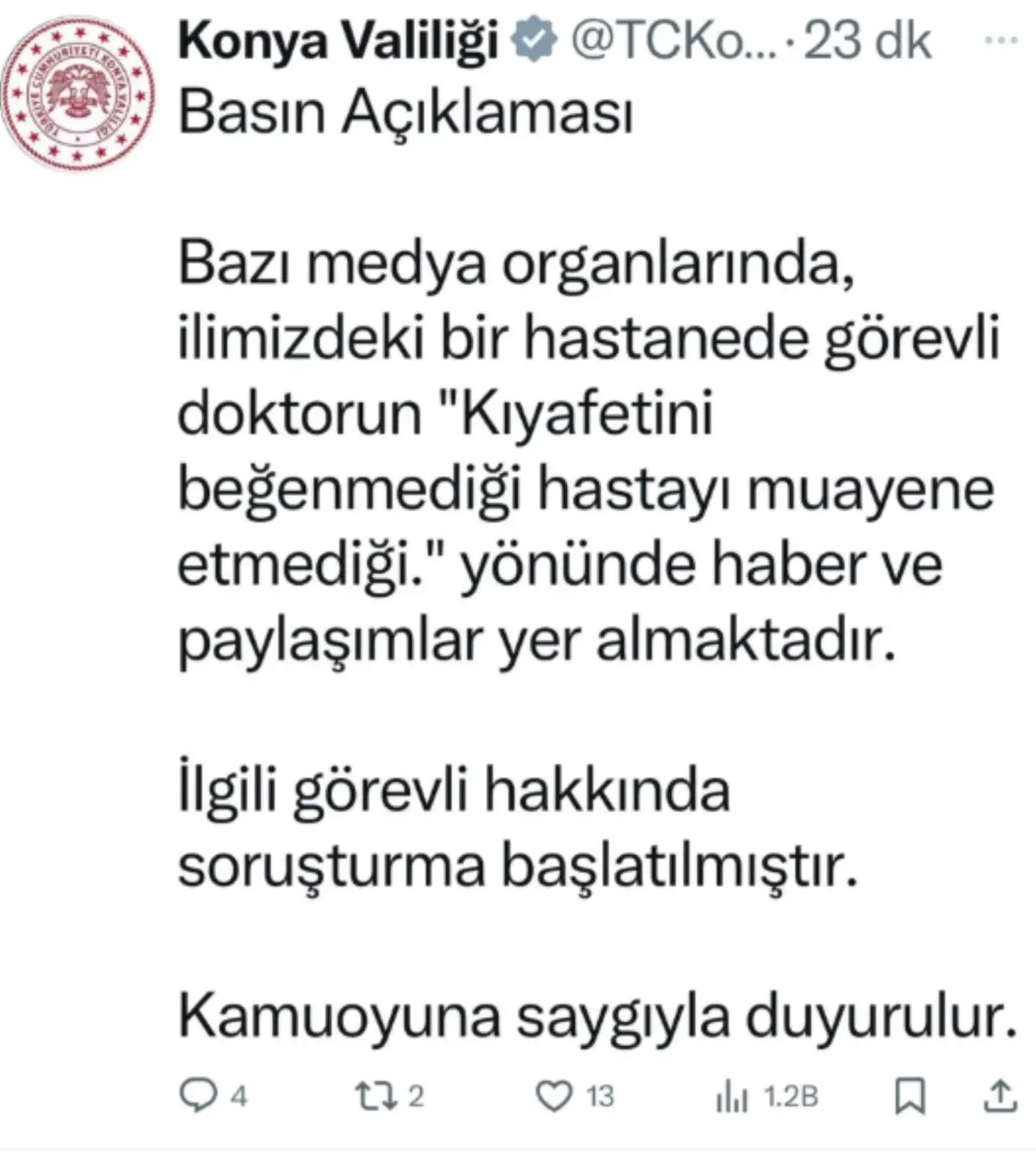Konya Valiliği, sosyal medya hesabından yaptığı açıklamada doktor hakkında soruşturma başlatıldığını duyurdu: "İlimizdeki bir hastanede görevli doktorun kıyafetini beğenmediği hastayı muayene etmediği yönünde haber ve paylaşımlar yer almaktadır. İlgili görevli hakkında soruşturma başlatılmıştır."