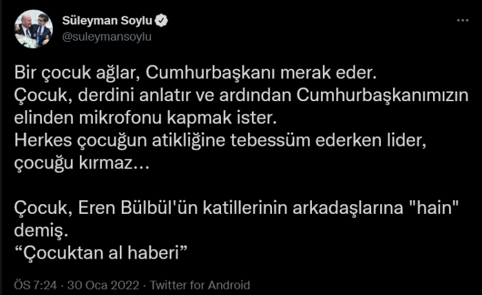 Muhalefetten yaşanan olayla ilgili tepki gelirken İçişleri Bakanı Süleyman Soylu, Twitter hesabından konuyla ilgili paylaşımda bulundu. Süleyman Soylu, "Çocuk Eren Bülbül'ün katillerinin arkadaşlarına hain demiş" dedi. Soylu'nun paylaşımı şöyle: