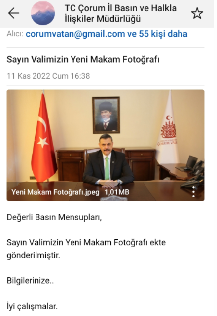 Çorum Valiliği tarafından yerel basına gönderilen e-postada, “Değerli basın mensupları, Sayın valimizin yeni makam fotoğrafı ekte gönderilmiştir, bilginize” denildi.