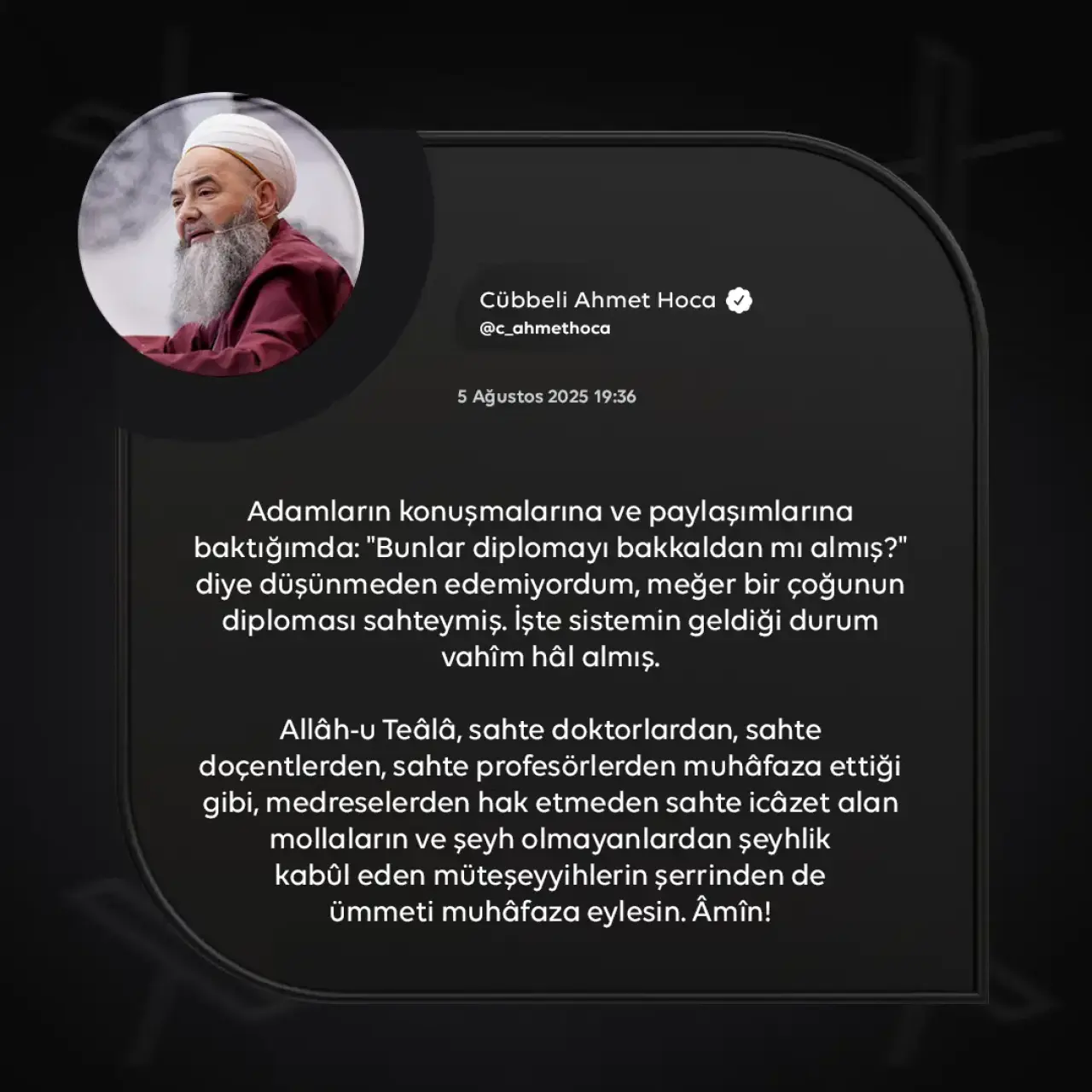 Kamuoyunda “Cübbeli Ahmet” olarak bilinen Ahmet Mahmut Ünlü, sosyal medya hesabından dikkat çeken bir açıklama yaptı. Ünlü, “Adamların konuşmalarına ve paylaşımlarına baktığımda; ‘Bunlar diplomayı bakkaldan mı almış?’ diye düşünmeden edemiyordum, meğer birçoğunun diploması sahteymiş. İşte sistemin geldiği durum vahim hâl almış.” ifadelerini kullandı.