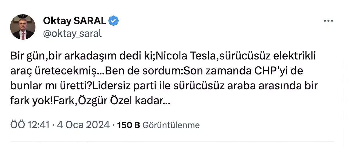 “Bir gün,bir arkadaşım dedi ki;Nicola Tesla,sürücüsüz elektrikli araç üretecekmiş…Ben de sordum:Son zamanda CHP’yi de bunlar mı üretti?Lidersiz parti ile sürücüsüz araba arasında bir fark yok!Fark,Özgür Özel kadar…”
