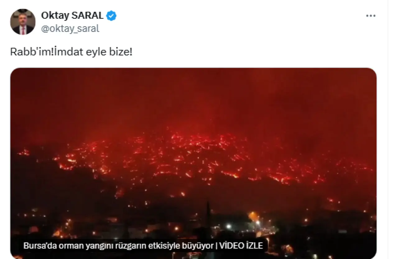 Cumhurbaşkanı Başdanışmanı Oktay Saral, sosyal medya hesabından yangınla ilgili olarak “Rabb’im! İmdat eyle bize” paylaşımında bulunmasıyla tepki çekti. Yetkililerin sorumluluklarını yerine getirmesi beklenirken, Saral’ın dua mesajı bazı kesimlerce “sorumluluktan kaçmak” ve “acziyetin itirafı” olarak değerlendirildi.