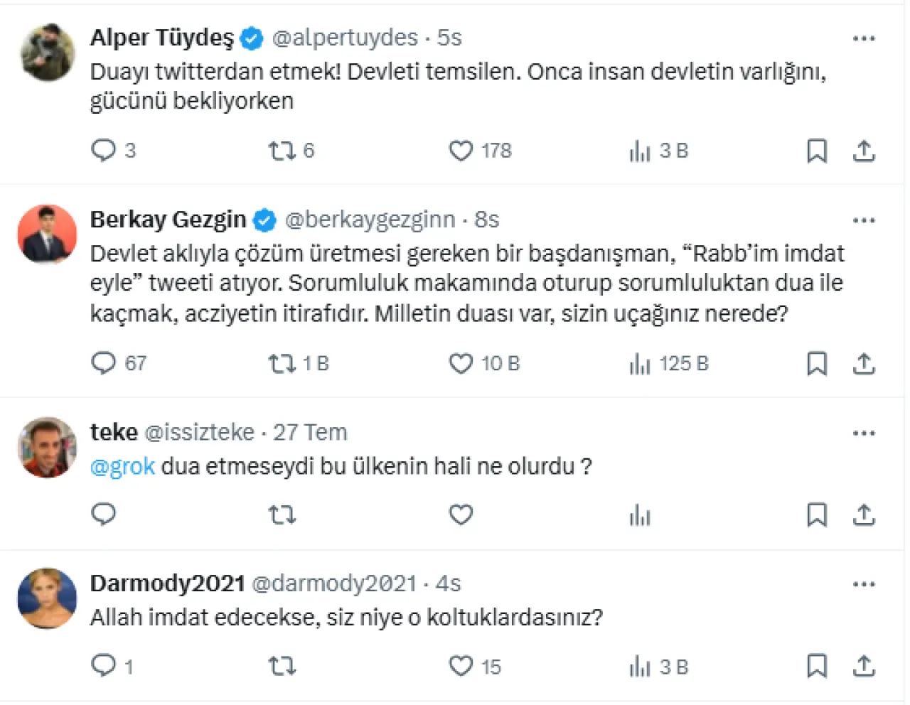 Sosyal medyada birçok kullanıcı, “Devlet aklıyla çözüm üretmesi gereken bir başdanışmanın Twitter’dan dua etmesi yeterli değil,” diyerek tepkisini dile getirdi. “Milletin duası var, sizin uçağınız nerede?” ve “Allah imdat edecekse siz niye o koltuklardasınız?” gibi yorumlar öne çıktı.