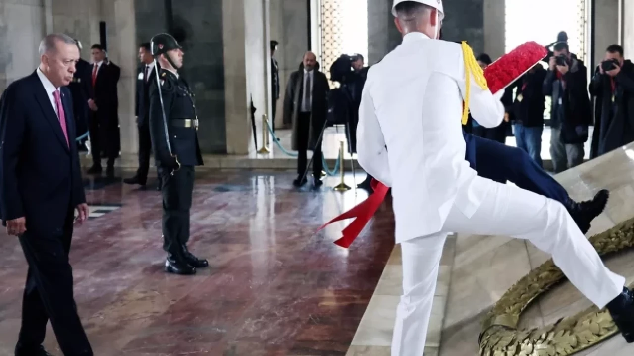Cumhurbaşkanı Erdoğan'ın ay yıldız motifli çelengi Atatürk'ün mozolesine bırakmasının ardından saygı duruşunda bulunuldu, İstiklal Marşı okundu.