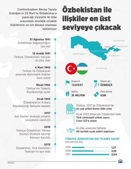 Konsey Toplantısı vesilesiyle Türkiye-Özbekistan ilişkilerinin ahdi zeminine önemli katkılar sağlayacak muhtelif anlaşma ve mutabakat metinlerinin imzalanması da gündemde yer alıyor.