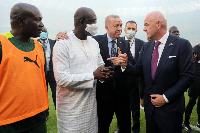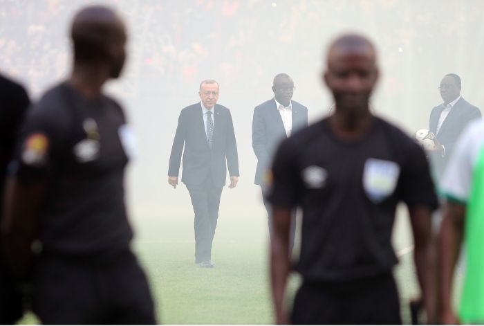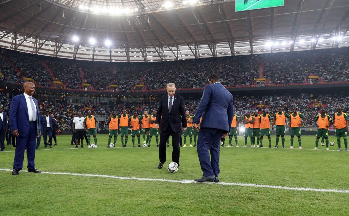 Gala maçı için sahaya çıkan Afrikalı eski oyuncular ve Senegal Milli Takımı'nın eski oyuncularıyla selamlaşan Cumhurbaşkanı Erdoğan, mevkidaşı Macky Sall ve diğer devlet başkanları futbolcularla paslaştı.