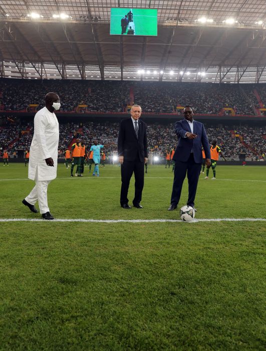 Senegal'in başkenti Dakar'a yaklaşık 30 kilometre mesafedeki Diamniadio bölgesinde bulunan stadyuma girişinde vatandaşları selamlayan Erdoğan, Senegal Cumhurbaşkanı Macky Sall ve eşi Mariama Faye Sall ile bir süre sohbet etti.
