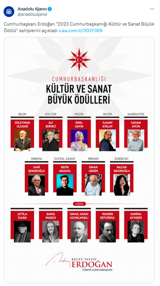 2023 Cumhurbaşkanlığı Kültür ve Sanat Büyük Ödülü sahipleri belli oldu. Cumhurbaşkanı Recep Tayyip Erdoğan’ın X hesabından yapılan paylaşımda müzik ödülünün sahibi Emel Sayın, Vefa ödülünün sahibi Atilla İlhan, Barış Manço, İsmail Hakkı Uzun çarşılı, Muhsin Ertuğrul ve Samiha Ayverdi oldu.