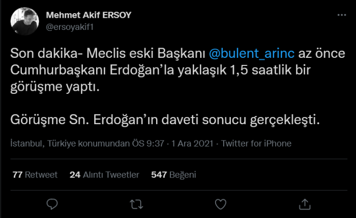 Cumhurbaşkanı Recep Tayyip Erdoğan ve eski TBMM Başkanı Bülent Arınç 1,5 saatlik bir görüşme gerçekleştirdi. Görüşmeyi Habertürk sunucusu Mehmet Akif Ersoy, Twitter hesabından duyurdu. Bülent Arınç son dönemde önemli açıklamalarda bulunmuştu. Arınç, "Erdoğan'a rakip olmayacağım diye içtihatta bulundum; beni fazla zorlamasınlar, içtihatlar değişebilir" ifadelerini kullanmıştı.