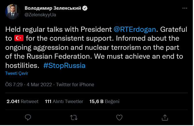 Ukrayna Devlet Başkanı Vladimir Zelenski, Twitter hesabından Cumhurbaşkanı Erdoğan ile görüştüğünü açıkladı. Vladimir Zelenski, Erdoğan'a Rusya'nın saldırganlığı ve nükleer terörizm hakkında bilgi verdiğini ifade etti. Zelenski, paylaşımında Rusya'nın düşmanlıklarına son verilmesi gerekiğini de belirtti.