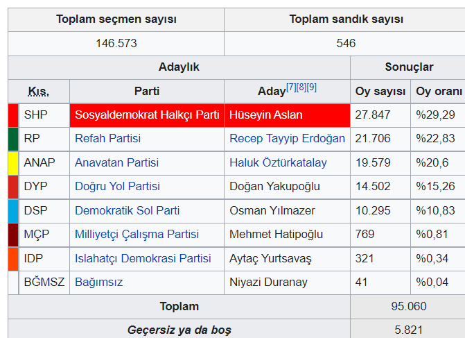 Belediye başkanı seçilen Hüseyin Aslan ise 27 bin 847 oy ile oyların yüzde 29.9'unu aldı.