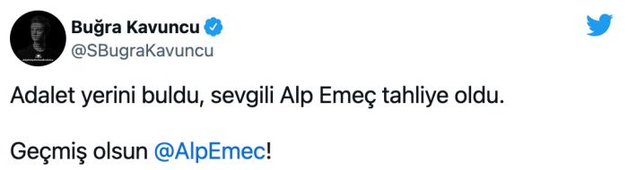 İyi Partili gencin tahliye haberini, partinin İstanbul İl Başkanı Buğra Kavuncu paylaştı. Kavuncu, "Adalet yerini buldu, sevgili Alp Emeç tahliye oldu. Geçmiş olsun Alp Emeç!" ifadelerine yer verdi.