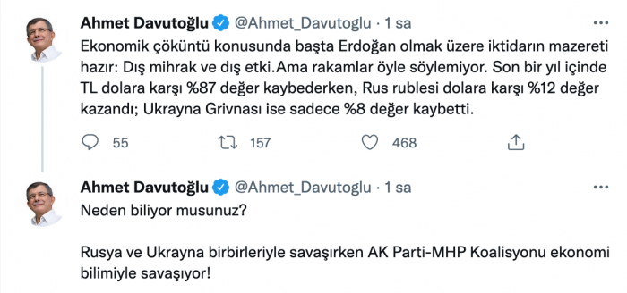Gelecek Partisi Genel Başkanı Ahmet Davutoğlu, ekonomi üzerinden iktidara eleştirilerde bulunarak, "Son bir yıl içinde TL dolara karşı yüzde 87 değer kaybederken, Rus rublesi dolara karşı yüzde 12 değer kazandı; Ukrayna Grivnası ise sadece yüzde 8 değer kaybetti. Neden biliyor musunuz? Rusya ve Ukrayna birbirleriyle savaşırken AK Parti-MHP Koalisyonu ekonomi bilimiyle savaşıyor" dedi.