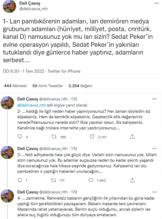 "Lan pambıkörenin adamları, lan Demirören Medya Grubu’nun adamları (Hürriyet, Milliyet, Posta, CNN Türk, Kanal D) namusunuz yok mu lan sizin? Sedat Peker’in evine operasyon yapıldı, Sedat Peker’in yakınları tutuklandı diye günlerce haber yaptınız, adamların serbest kaldığı ile ilgili neden haber yapmıyorsunuz? Her zaman söyledim siz köpeksiniz. Hem de kemiklik köpeksiniz. Gazetecilik etik değerleriniz nerede? Namusunuz nerede sizin? Size yazıklar olsun. Siz kahpesiniz. Kendinize bağlı trollere internette yazı yazdırıyorsunuz FETÖ adliyelerde hâlâ çok güçlü diye. Vallahi sizin namusunuz yok, billahi sizin namusunuz yok. Bu adamlar suçsuzsa neden bu kadar sıkıntı yaşandı diye soracağınıza hâlâ hikâye peşinde geziyorsunuz. Kahpesiniz lan siz. Pambıkören o yaptığın haberleri unutacağımı zannetme. Rahmetsiz babanın gençliğinin ilk yıllarından bugüne kadar yaptığı tüm şerefsizlikleri paylaşacağım. Babanı mezarda ters çevireceğim. Mezarında rahat yatamayacak. Benim suçlu olduğumu, ancak sizlerin ise ailece suç örgütü olduğunuzu tüm dünyaya anlatacağım.