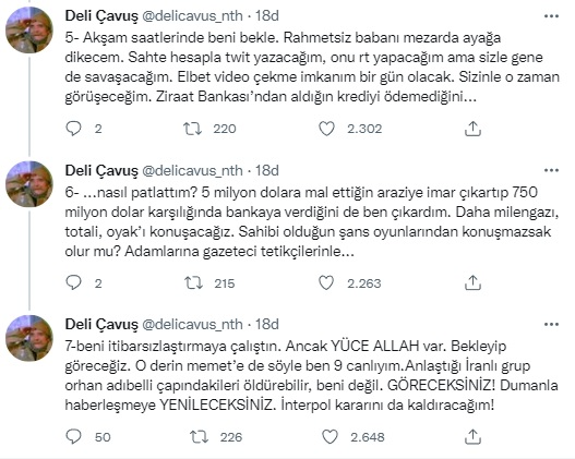 Akşam saatlerinde beni bekle. Rahmetsiz babanı mezarda ayağa dikeceğim. Sahte hesapla tweet yazacağım, onu RT yapacağım ama sizle gene de savaşacağım. Elbet video çekme imkanım bir gün olacak. Sizinle o zaman görüşeceğim.