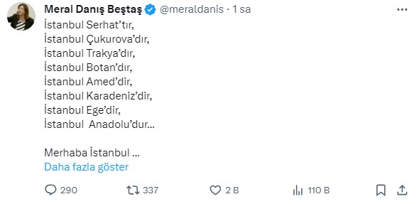 Halkların Eşitlik ve Demokrasi Partisi (DEM Parti) İstanbul Büyükşehir Belediyesi (İBB) Eş Başkan adayı Meral Danış Beştaş, adaylığı ilan edildikten sonra ilk paylaşımını yaptı.