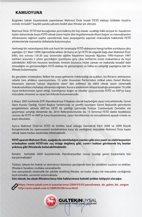 Gültekin Uysal, Sabah Gazetesi'nde yer alan Mahmut Övür'ün kaleme aldığı "FETÖ elebaşı Gültekin Uysal’ın evinde mi kaldı?" başlıklı yazıya yönelik olarak iftira değerlendirmesinde bulundu.