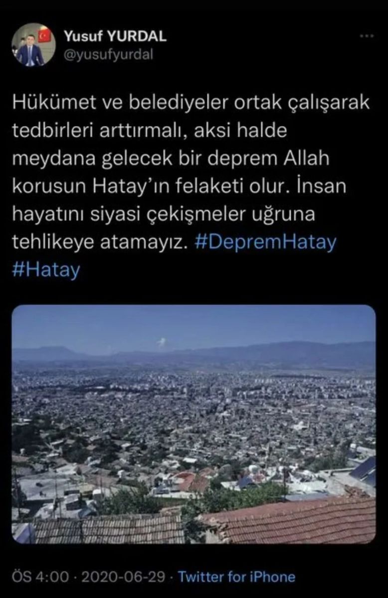Depremde yaşamını yitiren DEVA Partisi Hatay İl Başkan Yardımcısı Yusuf Yurdal'ın da, 2020 yılında yaptığı paylaşımda, Hatay'daki deprem riskine dikkat çektiği ortaya çıktı.