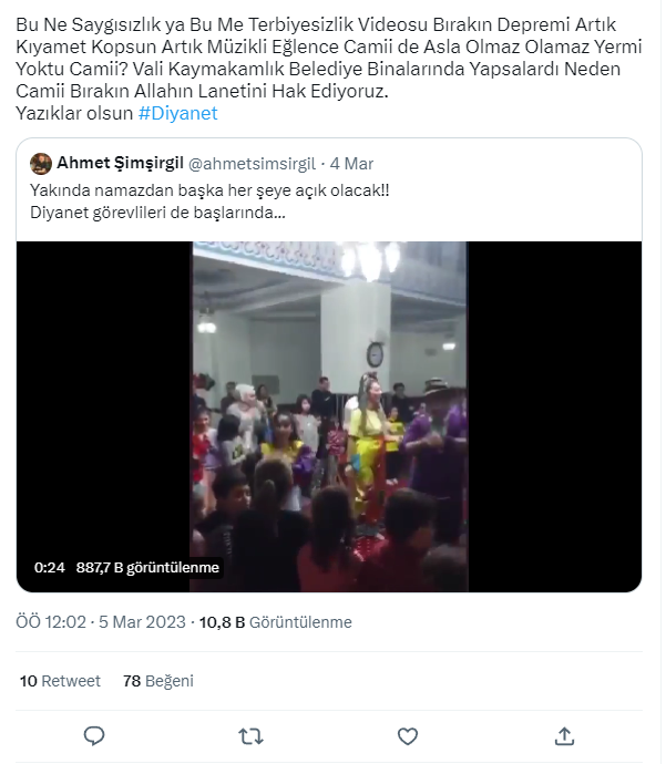 “Bu Ne Saygısızlık ya Bu Me Terbiyesizlik Videosu Bırakın Depremi Artık Kıyamet Kopsun Artık Müzikli Eğlence Camii de Asla Olmaz Olamaz Yermi Yoktu Camii? Vali Kaymakamlık Belediye Binalarında Yapsalardı Neden Camii Bırakın Allahın Lanetini Hak Ediyoruz.  Yazıklar olsun”