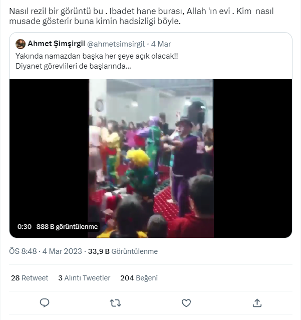 “Camiler şaklabanlık yapılacak, panayır yerine çevrilecek, çocukların oynayayacağı, müziklerin çalındığı vs vs.. eğlence merkezi değildir. Allah akıl fikir versin.yazıklar olsun. Camiler sadece  ve sadece ibadet yeridir ”