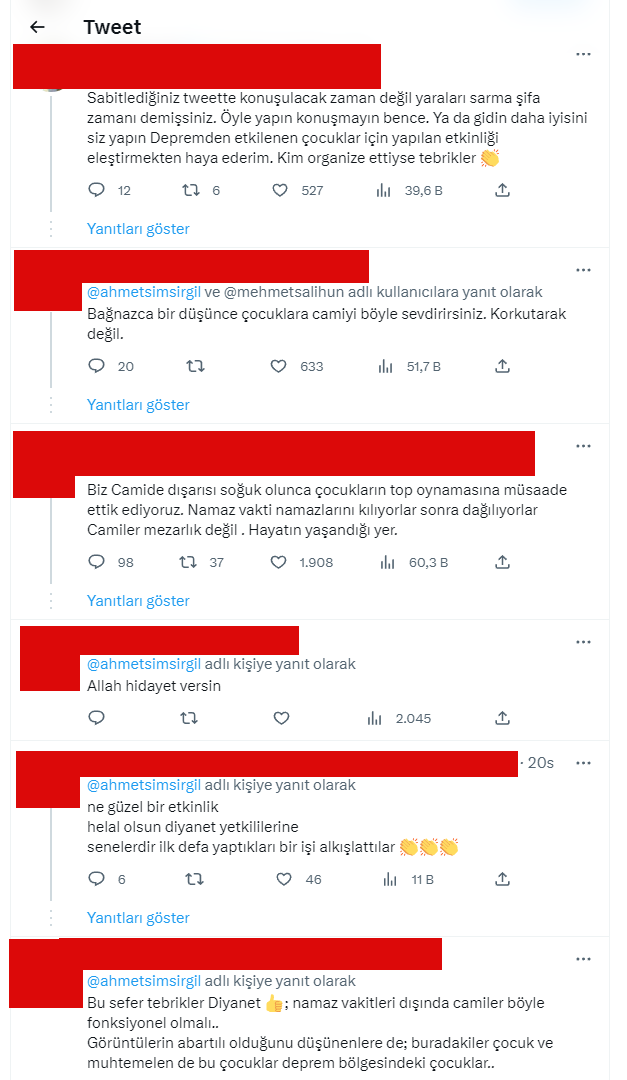 Tarihçi Ahmet Şimşirgil depremzede çocukların camide oyun oynadığı bir video paylaşarak, "Yakında namazdan başka her şeye açık olacak!, Diyanet görevlileri de başlarında..." ifadelerini kullandı.