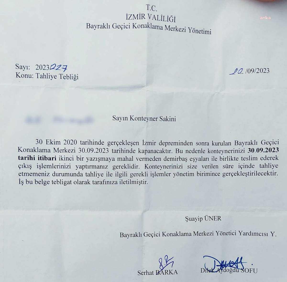 “Sayın Konteyner Sakini, 30 Ekim 2020 tarihinde gerçekleşen İzmir depreminden sonra kurulan Bayraklı Geçici Konaklama Merkezi 30.09.2023 tarihinde kapanacaktır. Bu nedenle konteynerinizi 30.09.2023 tarihi itibari ikinci bir yazışmaya mahal vermeden demirbaş eşyaları ile birlikte teslim ederek çıkış işlemlerinizi yaptırmanız gereklidir. Konteynerinizi size verilen süre içinde tahliye etmemeniz durumunda tahliye ile ilgili gerekli işlemler yönetim birimince gerçekleştirilecektir. İş bu belge tebligat olarak tarafınıza iletilmiştir.”