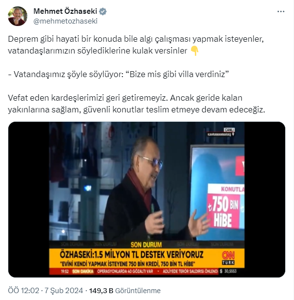 X hesabından açıklama yapan Özhaseki, "Deprem gibi hayati bir konuda bile algı çalışması yapmak isteyenler, vatandaşlarımızın söylediklerine kulak versinler. Vatandaşımız şöyle söylüyor: 'Bize mis gibi villa verdiniz" dedi.