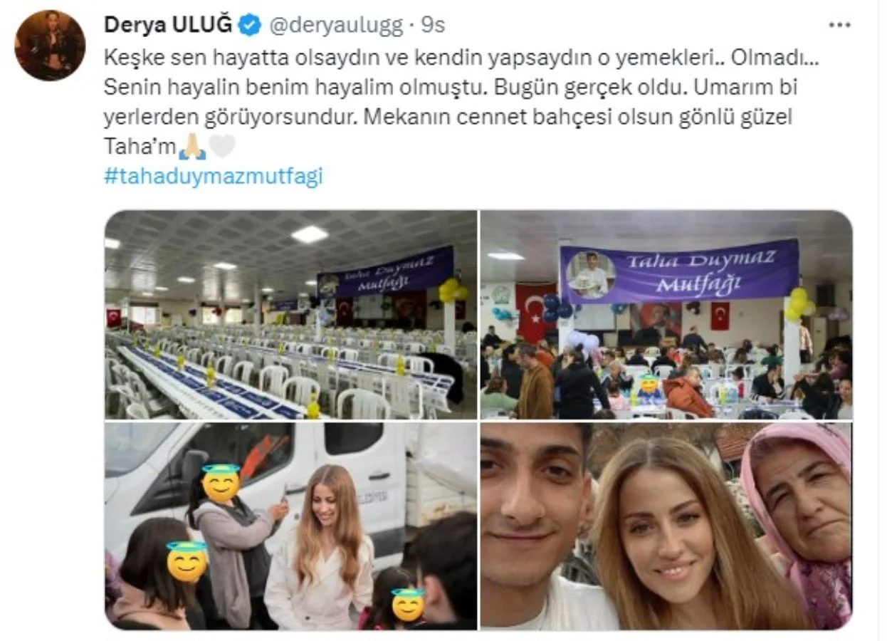 Derya Uluğ, Hatay'a giderek Taha Duymaz adına iftar yemeği verdi. "Taha Duymaz Mutfağı" yazılı pankartlar astıran şarkıcı, fenomenin ailesiyle de bir araya geldi.