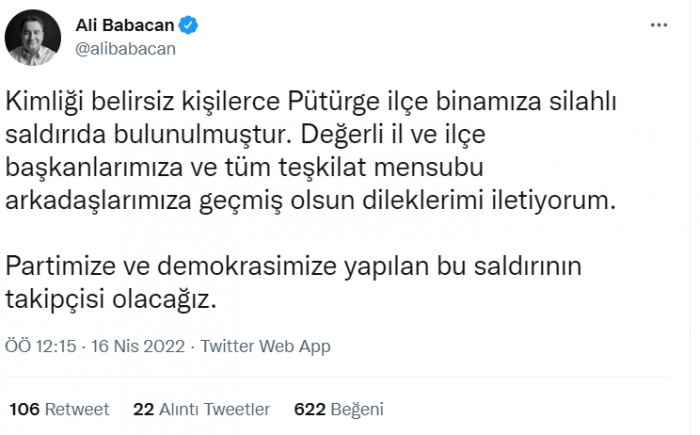 "Kimliği belirsiz kişilerce Pütürge ilçe binamıza silahlı saldırıda bulunulmuştur. Değerli il ve ilçe başkanlarımıza ve tüm teşkilat mensubu arkadaşlarımıza geçmiş olsun dileklerimi iletiyorum.