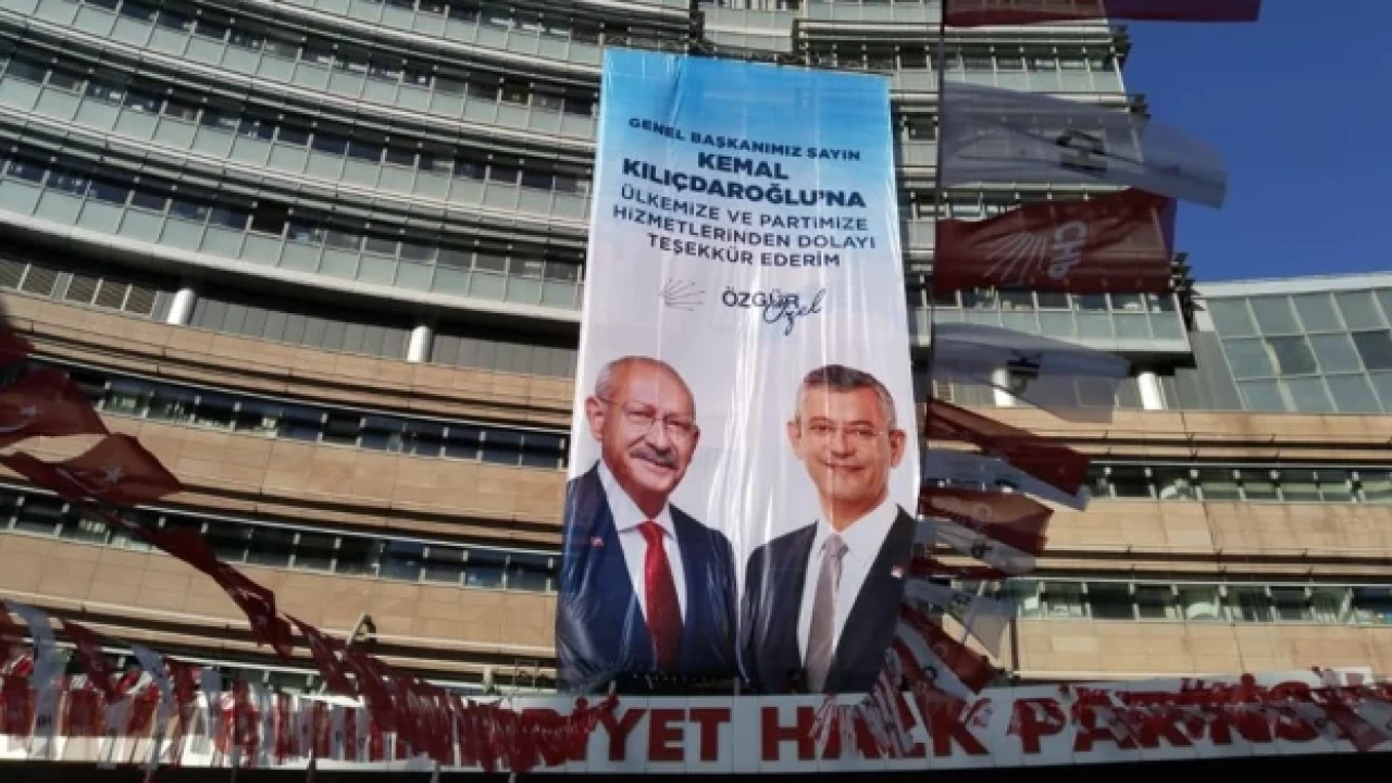 CHP Genel Merkezi'nde yapılacak tören öncesi parti binasına asılan dev pankartta Özgür Özel imzası ile “Genel Başkanımız Sayın Kemal Kılıçdaroğlu’na, ülkemize ve partimize hizmetlerinden dolayı teşekkür ederim” sözleri yer aldı.