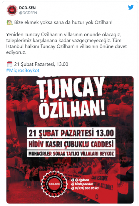 İstanbul Esenyurt’taki Migros deposunda çalışan ve daha iyi bir ücret için mücadele etmeleri nedeniyle işten çıkarılan Depo, Liman, Tersane ve Deniz İşçileri Sendikası (DGD-Sen) üyesi işçiler, bir kez daha patron Tuncay Özilhan'ı villasının önünde protesto edeceklerini duyurdu.