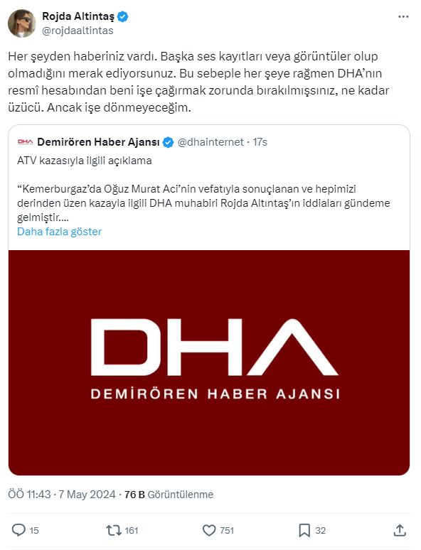 ”Her şeyden haberiniz vardı. Başka ses kayıtları veya görüntüler olup olmadığını merak ediyorsunuz. Bu sebeple her şeye rağmen DHA’nın resmî hesabından beni işe çağırmak zorunda bırakılmışsınız, ne kadar üzücü. Ancak işe dönmeyeceğim.”