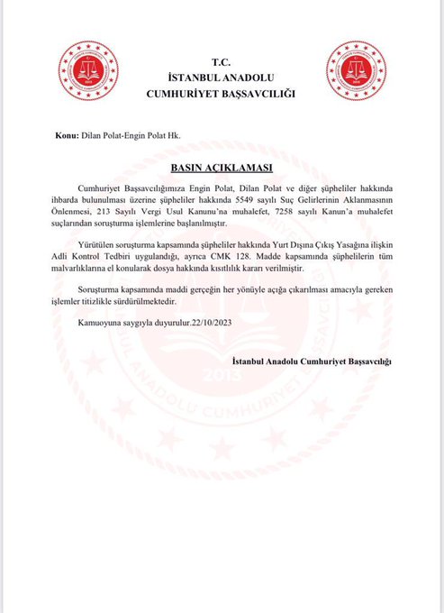 "Cumhuriyet Başsavcılığımıza Engin Polat, Dilan Polat ve diğer şüpheliler hakkında ihbarda bulunulması üzerine şüpheliler hakkında 5549 sayılı Suç Gelirlerinin Aklanmasının Önlenmesi, 213 Sayılı Vergi Usul Kanunu’na muhalefet, 7258 sayılı Kanun’a muhalefet suçlarından soruşturma işlemlerine başlanılmıştır. Yürütülen soruşturma kapsamında şüpheliler hakkında Yurt Dışına Çıkış Yasağına ilişkin Adli Kontrol Tedbiri uygulandığı, ayrıca CMK 128. Madde kapsamında şüphelilerin tüm malvarlıklarına el konularak dosya hakkında kısıtlılık kararı verilmiştir. Soruşturma kapsamında maddi gerçeğin her yönüyle açığa çıkarılması amacıyla gereken işlemler titizlikle sürdürülmektedir"