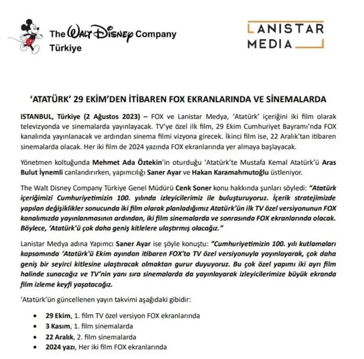 “FOX ve Lanistar Medya, ‘Atatürk’ içeriğini iki film olarak televizyonda ve sinemalarda yayınlayacak. TV’ye özel ilk film, 29 Ekim Cumhuriyet Bayramı’nda FOX kanalında yayınlanacak ve ardından sinema filmi vizyona girecek. İkinci film ise, 22 Aralık’tan itibaren sinemalarda olacak. Her iki film de 2024 yazında FOX ekranlarında yer almaya başlayacak.