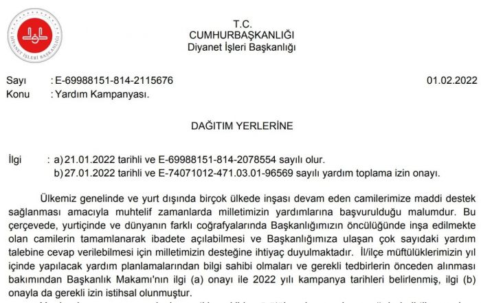 Diyanet tarafından il ve ilçe müftülüklerine 1 Şubat’ta gönderilen yazıda, “inşa edilmekte olan camilerin tamamlanarak ibadete açılabilmesi için milletin desteğine ihtiyaç duyulduğu” ifade edildi, 18 Şubat’ta “cuma namazı sonrası sergi sererek ya da kutu koyarak” yardım toplanması istendi. Vaazlarda ve okunacak hutbelerde “yardım kampanyasının amacının anlatılacağı ve milletin kampanyaya azami derecede ilgi göstermesi hususunda gayret sarf edileceği” vurgulanan yazıda, “Hiçbir cami, yardım toplama faaliyetinin kapsamı dışında tutulmayacak. Her camide görevlilerimizin yardım toplama faaliyetlerinde gereken özeni göstermesi sağlanacaktır” ifadeleri kullanıldı. Bu kapsamda, il müftülükleri de valilik oluru alarak “Cami Yardım Toplama Komisyonu” üyelerine “yardım toplama tutanağı” iletti.