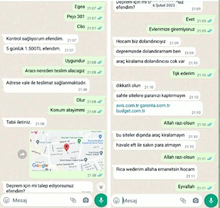 Konuşmanın devamında 5 günlük bin 500 liraya araç kiraladığını söyleyen dolandırıcı aracı vale ile teslim edeceklerini söyledi. Konumun deprem bölgesinde olduğunu fark eden dolandırıcı, 'Deprem için mi araç talep ediyorsunuz efendim' yanıtına depremzedenin, 'Evet evlerimize giremiyoruz' yanıtı vermesiyle 'Hocam biz dolandırıcıyız, depremzede dolandıramam. Araç kiralama dolandırıcısı çok var. Dikkatli olun, sahte sitelere paranızı kaptırmayın' uyarısında bulundu.