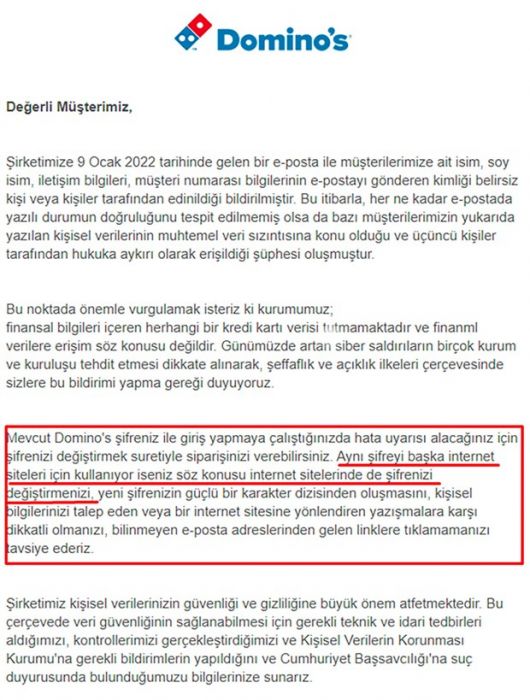 "Kurumumuz, finansal bilgileri içeren herhangi bir kredi kartı verisi tutmamaktadır. Bu yüzden finansal verilere erişim söz konusu değildir. Günümüzde artan siber saldırıların birçok kurum ve kuruluşu tehdit etmesi dikkate alınarak, şeffaflık ve açıklık ilkeleri çerçevesinde bu bildirimi sizlerle paylaşma gereği duyduk. Mevcut Domino’s şifreniz ile giriş yapmaya çalıştığınızda hata uyarısı alacağınız için şifrenizi değiştirip sipariş vermeniz gerekmektedir. Aynı şifreyi başka siteler için kullanıyorsanız da bu şifreleri değiştirmenizi, yeni şifrenizin güçlü karakterlerden oluşmasını, kişisel bilgilerinizi talep eden yazışmalarda dikkatli olmanızı ve bilinmeyen adreslerden gelen e-postalardaki linklere tıklamamanızı tavsiye ederiz”