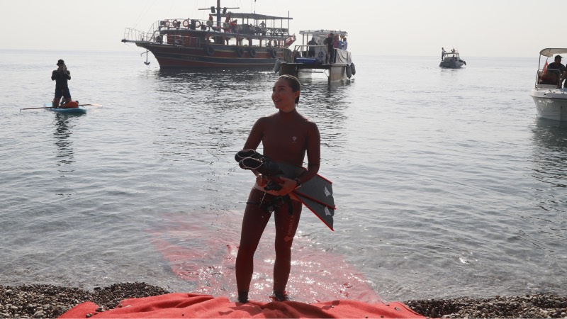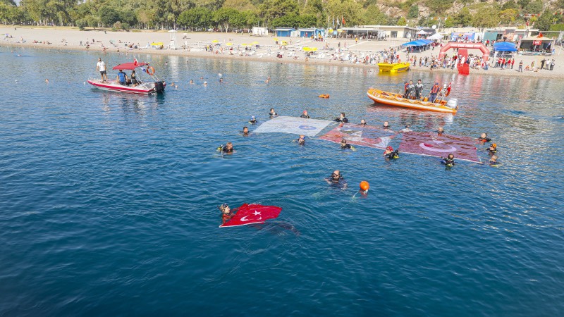 Milli Sporcu ve Serbest Dalış Rekortmeni Şahika Ercümen de Konyaaltı Sahili'nden tekneyle açılıp, serbest dalış gerçekleştirdi. Dipten, üzerinde 'Türkiye Cumhuriyeti 100 yaşında' yazılı pankartla su yüzeyine çıkan Ercümen'i hem sahildeki kalabalık hem de tekneden kendisini izleyenler uzun süre alkışladı.