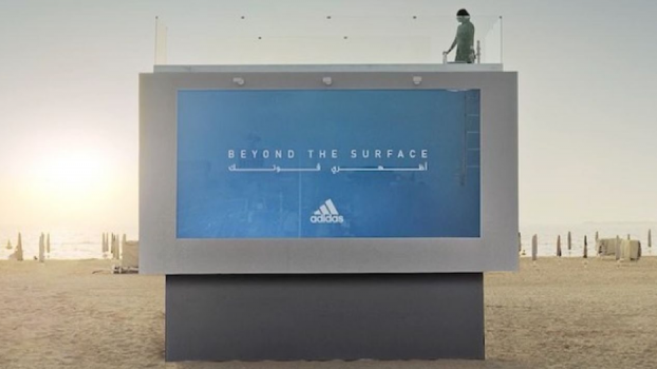 adidas, geçtiğimiz günlerde dünyada bir ilk niteliği taşıyan reklam çalışmasını sosyal medyadan duyurdu. Dubai'nin en popüler plajlarından birine gerçek bir yüzme havuzu işlevine sahip reklam panosu yerleştirerek görenleri şaşırttı.