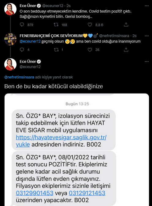 Twitter'dan bir kullanıcı ise Üner'in açıklamasına inanmadığını belirtti. Üner'de "ben de bu kadar kötücül olabildiğinize" inanamıyorum diyerek Sağlık Bakanlığının kendisine gönderdiği kısa mesajı paylaştı.