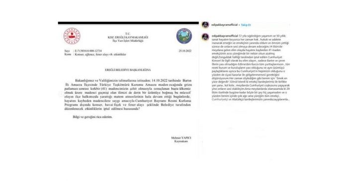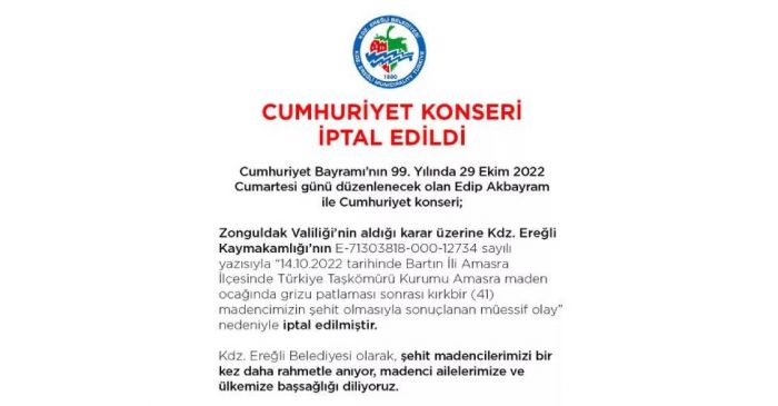 “Cumhuriyet Bayramı'nın 99. yılında, 29 Ekim 2022 Cumartesi günü düzenlenecek olan Edip Akbayram ile Cumhuriyet konseri, Zonguldak Valiliği'nin aldığı karar üzerine Kdz. Ereğli Kaymakamlığı'nın E-71303818-000-12734 sayılı yazısıyla ‘14.10.2022 tarihinde Bartın ili Amasra ilçesinde, Türkiye Taşkömürü Kurumu Amasra maden ocağında grizu patlaması sonrası 41 madencimizin şehit olmasıyla sonuçlanan müessif olay' nedeniyle iptal edilmiştir. Kdz. Ereğli Belediyesi olarak, şehit madencilerimizi bir kez daha rahmetle anıyor, madenci ailelerimize ve ülkemize başsağlığı diliyoruz.”