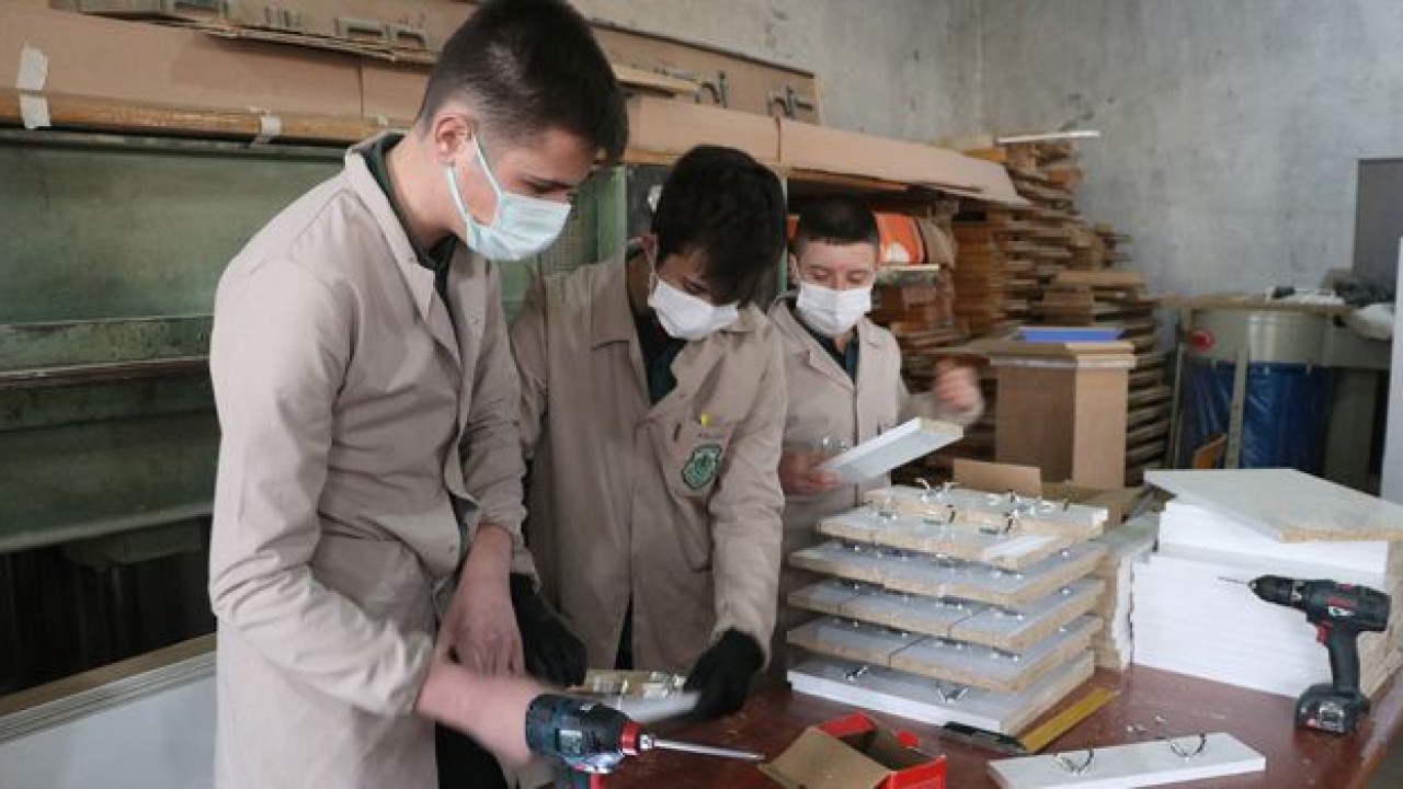 Öğrenciler bugünlerde Edirne ve Kırklareli'ndeki ana okulları için 4 parçadan oluşan mobilya setlerini tamamlamak için mesai harcıyor. Okul mobilyaları üretimi için tahtaları keserek şekil veren öğrenciler, ince işçiliğin ardından mobilyaların montajını gerçekleştiriyor.